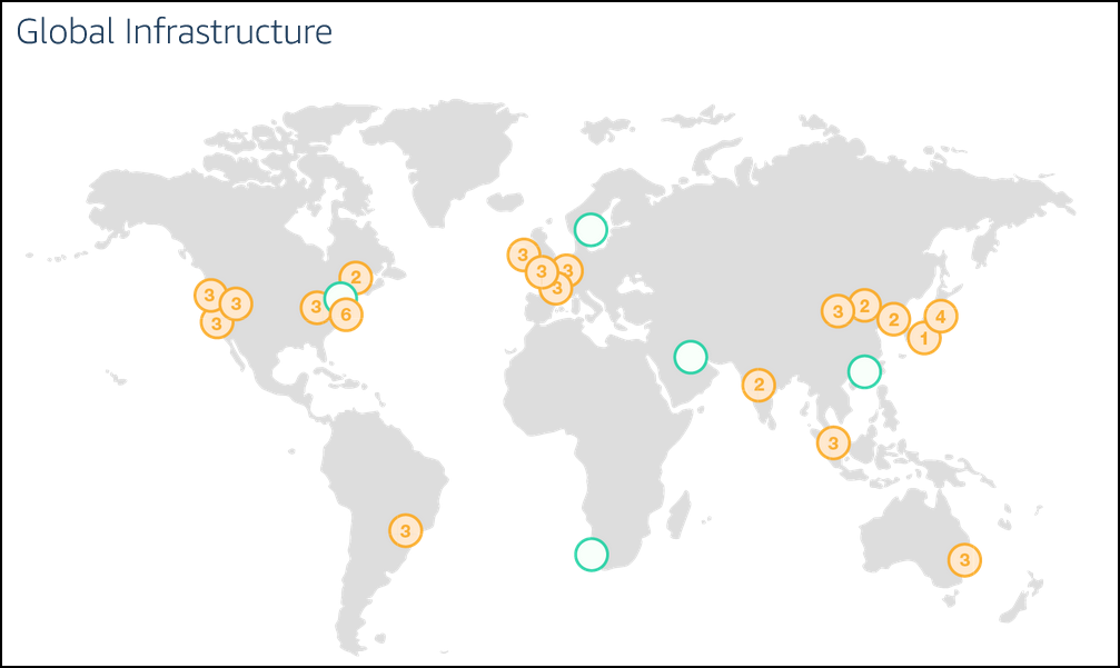 AWS는 이렇게 높은 가용성과 내구성을 어떻게 보장하는걸까? 아래 지도에서 주황색 부분은 각 지역 내에 위치한 가용영역, 즉 데이터 센터(IDC)의 수를 뜻한다. 가용 영역들이 떨어져있는걸 볼 수 있는데, 이렇게 떨어져있는 덕분에 한 곳의 서버가 멈추거나 하더라도 다른 곳에서 백업해둔 데이터를 활용할 수가 있게되는 것이다.