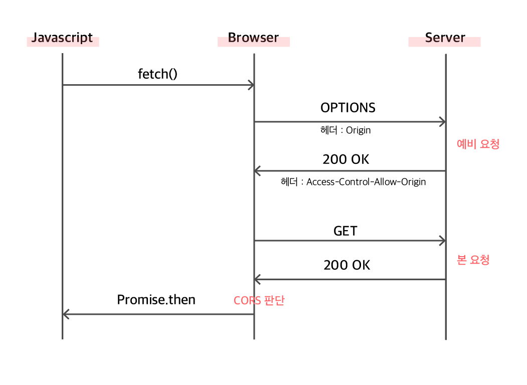 Preflight 요청 상황에서 브라우저는 요청을 예비 요청 + 본 요청으로 나눠서 보낸다. 주의할 점은 예비 요청을 할 때 OPTIONS 메서드를 반드시 사용해야한다는 것이다. 그림으로한번 살펴보자.