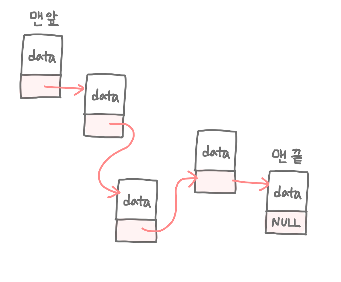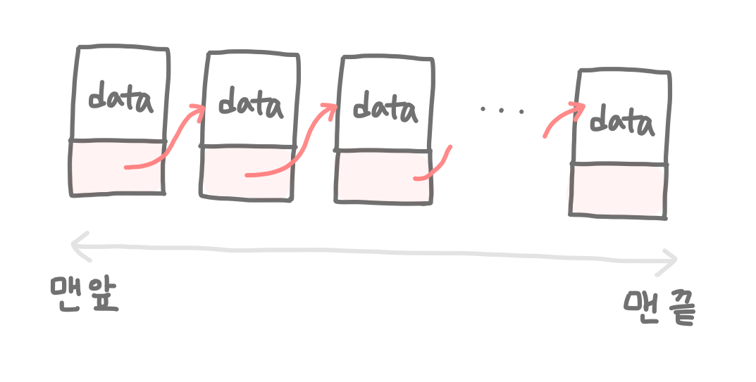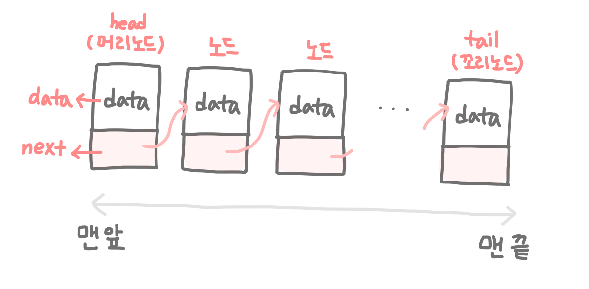 조금만 더 자세히 살펴보자. 연결 리스트에 일렬로 연결된 데이터들을 각각 노드(node)라고 한다. 그리고 이 노드들은 각각 1) 데이터(data)와 2) 다음 노드 정보(next)를 갖는다.