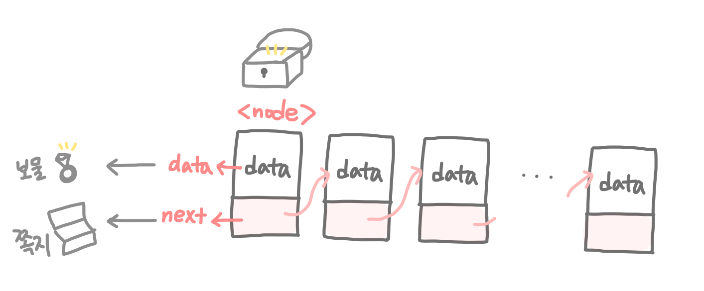 지금까지의 이야기를 보물 찾기에 비유해서 생각해보자. 노드는 보물상자, 데이터(data)는 보물상자 안의 보물, 다음 노드의 정보(next)는 다음 보물 위치를 알려주는 쪽지라고 생각할 수 있다!