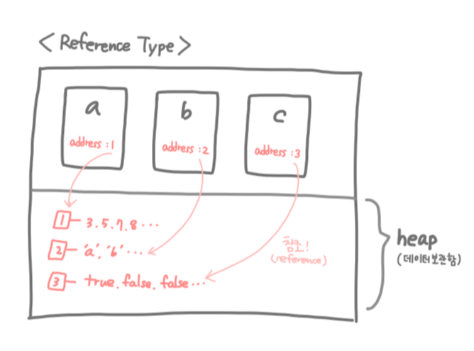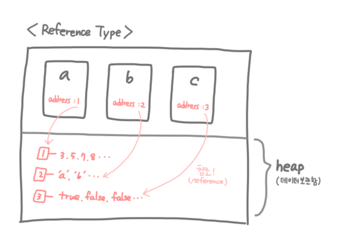 Reference Type은 저장 공간의 크기가 동적으로 변하는 자료형 타입이다. Primitive와는 달리 값(value) 대신 주소(address)를 함께 저장한다. 주소를 따라가보면 각 주소마다 여러개의 데이터가 보관되어있는 것을 볼 수 있다. 이런 여러개의 데이터들이 보관되어 있는 공간을 'heap'이라고 한다. 주소 타입에는 Array, Object, Function 등이 포함된다. 오른쪽에 그림으로 a=[3,5,7,8], b=['a','b'], c=[true, false, false]인 상태를 표현해 봤다.