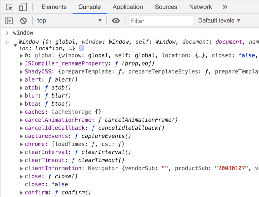 console창에 window라고 쳐보면 오른쪽 그림과 같이 모든 전역 범위의 변수들을 key, value 쌍으로 확인해 볼 수 있다. 전역 범위에 너무 많은 변수를 선언하는 것은 권장하지 않는다. 그리고 let으로 선언된 경우에는 window에 저장되지 않지만, var로 선언된 경우에는 window에 저장이 된다.