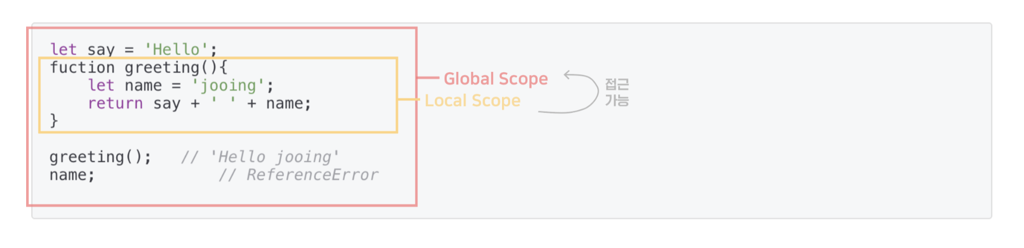 따라서 greeting();은 Local Scope에서 실행되기 때문에 Global Scope의 say 변수, Local Scope의 name 변수에 모두 접근이 가능해 유효한 변수이기 때문에 의도했던 'Hello jooing'이 잘 출력된다. 하지만 Global Scope에서 실행되는 name;은 Local Scope에 있는 name 변수에 직접 접근할 수 없어 ReferenceError가 발생하게 된다. ReferenceError은 참조할 값을 찾지 못했을 때 발생하는 오류이다.