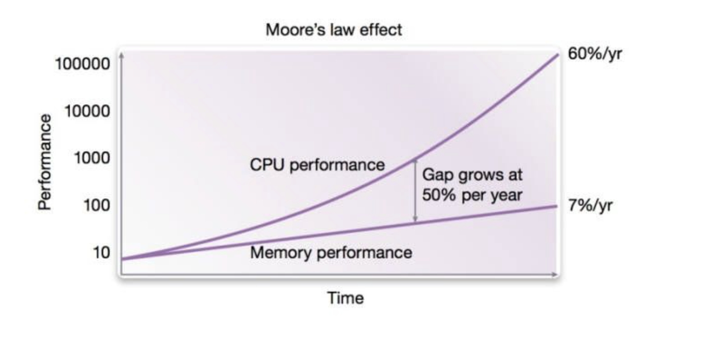 아래 그래프에서도 볼 수 있듯이 CPU의 메모리 접근속도는 기술이 발전하면서 지수적으로 증가해왔다. 물론 RAM의 접근속도도 많이 증가했지만, CPU가 증가하는 것에 비하면 더딘 편이다. 이렇게 CPU와 RAM의 메모리 성능이 차이나는 것을 '프로세서-메모리 격차'라고 한다. 이런 격차에 대응하기 위해서는 어떻게 해야할까? 메모리에 좀 더 효율적으로 접근하는 방법에 대한 고민을 해야할 것이다. 컴퓨터 공학자들은 같은 계산을 처리하더라도 RAM이 연산하는 횟수를 최대한 줄이는 방법을 연구했고, 어떤 규칙성을 찾아냄으로써 효율성을 높일 수 있었다.