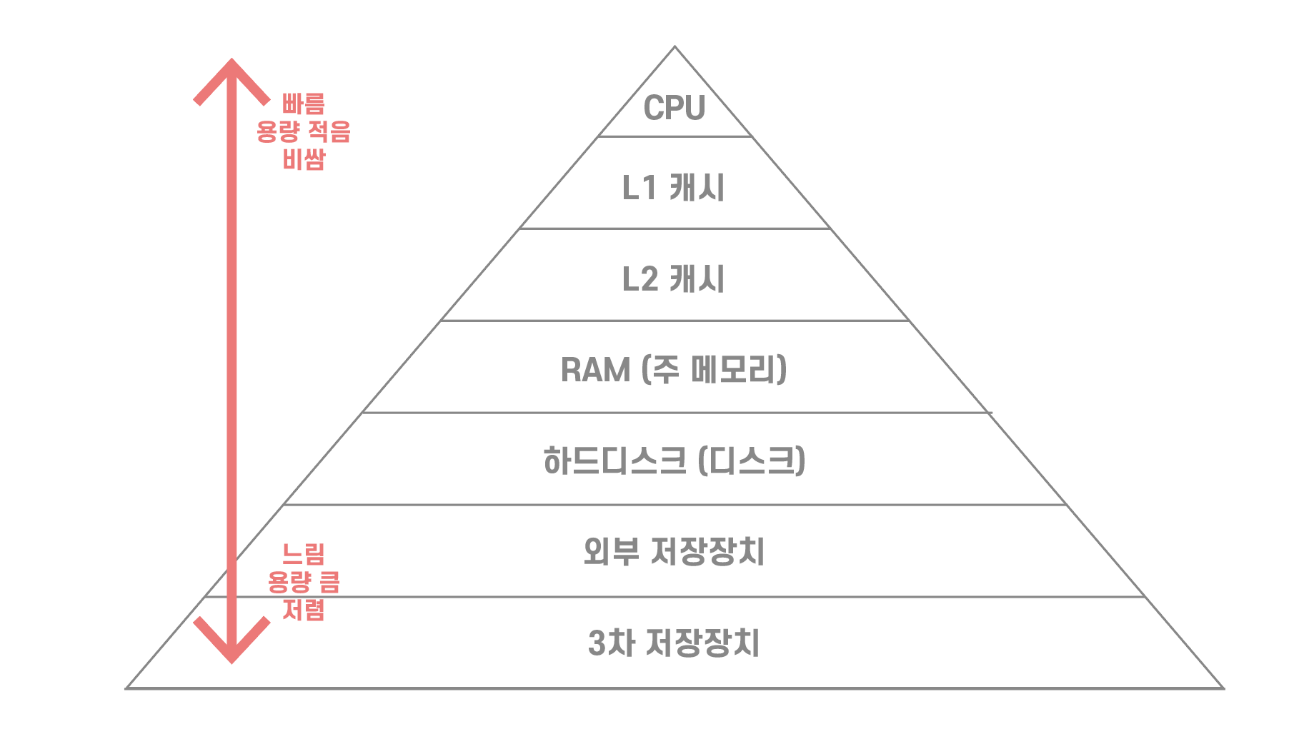이 피라미드의 위쪽에 위치할수록 속도가 빠르고, 용량이 작고, 비싸다는 특징이 있다. 반대로 아래쪽에 있을수록 접근속도가 느리고, 용량이 크고, 저렴해진다. 그리고 L1, L2가 작동하는 방식처럼, 한 층의 메모리는 바로 아래층 메모리의 캐시 역할을 한다.