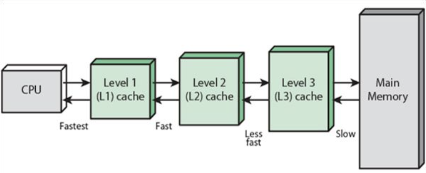 하지만, CPU와 RAM은 메모리 접근속도 측면에서 차이가 난다. CPU는 RAM에 비해 속도가 굉장히 빠르다. CPU 명령어는 짧은 시간 내에 여러 연산들을 많이 수행할 수 있지만, RAM에서 데이터를 가져오는 시간은 훨씬 오래 걸리기 때문이다. 이렇게 되면 결국 CPU는 RAM에게 데이터를 읽거나 쓰는 작업을 요청하고, 작업이 진행되는 동안 마냥 기다려야 한다는 것이다. 아무리 CPU가 연산을 빠르게 수행해도, 데이터를 가져오고 저장하는 부분의 작업속도가 느리면 전체적인 처리 속도는 느려지게 된다.